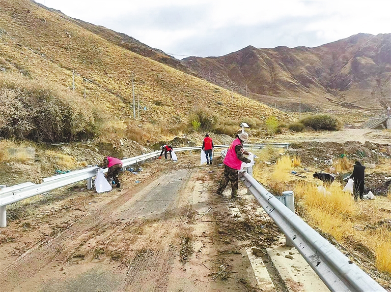 圖為志愿者對(duì)嘎巴村公路沿線和空地的白色垃圾、飲料瓶及塑料袋等進(jìn)行清理。記者 格桑倫珠 攝