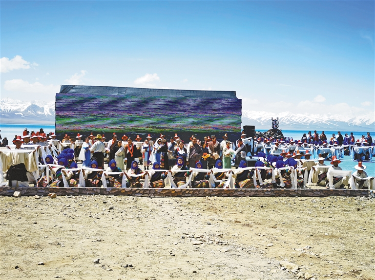 由300名演員將象征平安、吉祥的馬、牦牛、牛角、五彩哈達(dá)等元素融入表演全過程,藝術(shù)地展現(xiàn)獨(dú)有的開湖祈福場景。