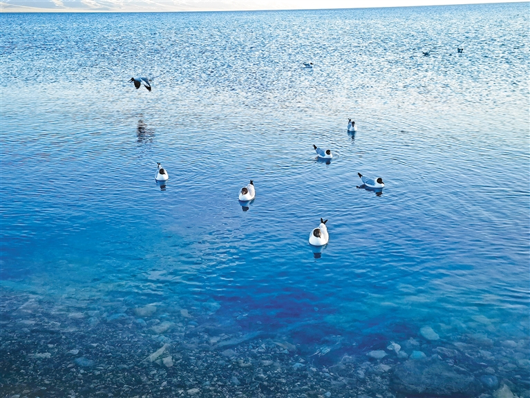 山與水相擁而生,文與旅相融而興。5月18日傍晚,在納木措,遠(yuǎn)遠(yuǎn)望去,蔚藍(lán)遼闊的湖面與天際連成一線,清澈的湖水與遠(yuǎn)處的念青唐古拉山相互輝映、水天一色,湖水輕柔地拍打岸邊砂石,一群棕頭鷗在消逝的湖面上嬉戲玩鬧,邀請游客共賞這絕美的視覺盛宴。