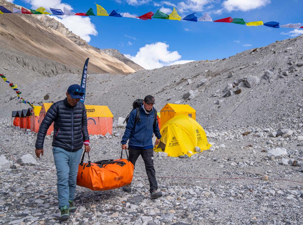 哈康·埃蘭森(右)正在搬運自己的登山物資(5月24日攝)。新華社記者 孫非 攝