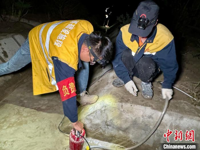 如墨的夜色下,經過2個小時的連續(xù)抽水,排水溝的大部分積水被抽出,職工們頭戴照明燈,手握鐵鍬一字擺開,開始深一腳淺一腳,清理溝底淤泥,道道搖曳不定的光柱,在靜默的夜空下閃爍交織。