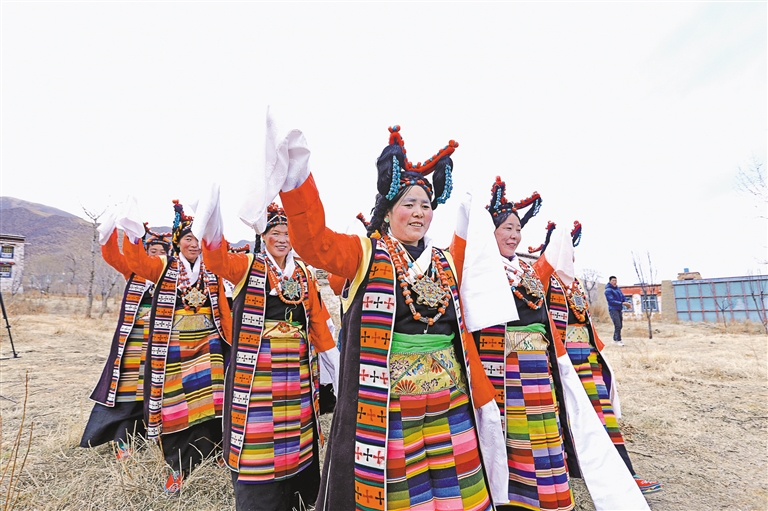 “如今,這支隊(duì)伍已發(fā)展到20多名成員,都是當(dāng)?shù)厝罕?。藝術(shù)隊(duì)經(jīng)常受邀參加各種大小晚會(huì)、重要節(jié)日演出和赴區(qū)內(nèi)外非遺展演等,其影響力和傳播力不斷提升,特別是甲瑪諧欽《和親路》受到廣泛歡迎?!奔赚斷l(xiāng)工作人員德吉卓嘎說。