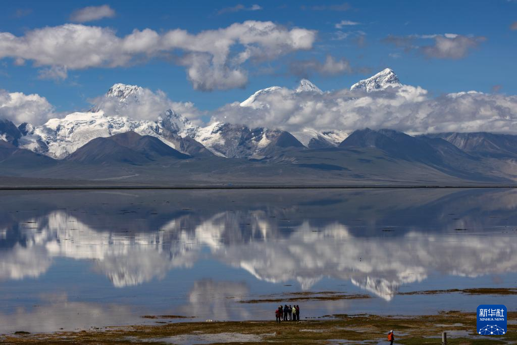 8月1日,游人在多慶錯國家濕地公園拍攝卓木拉日雪山。新華社記者 姜帆 攝