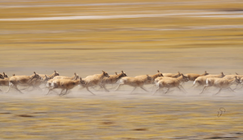 2024年6月13日,遷徙中的藏羚羊在西藏羌塘國家級自然保護(hù)區(qū)奔跑。