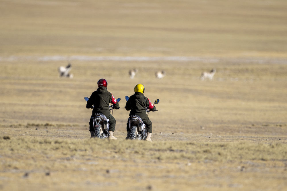 2023年12月17日,在西藏羌塘國家級自然保護(hù)區(qū),野生動物管護(hù)隊(duì)員騎著摩托車觀察藏羚羊。