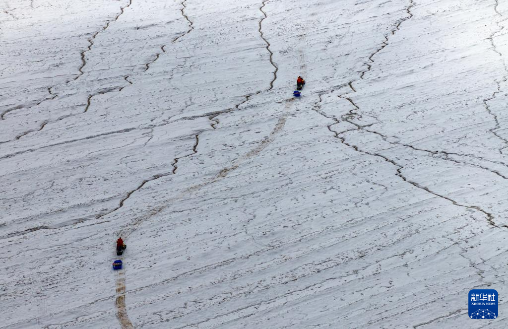 科考隊(duì)員搭乘雪地摩托前往冰原深處作業(yè)(無人機(jī)照片,9月4日攝)。新華社記者 姜帆 攝