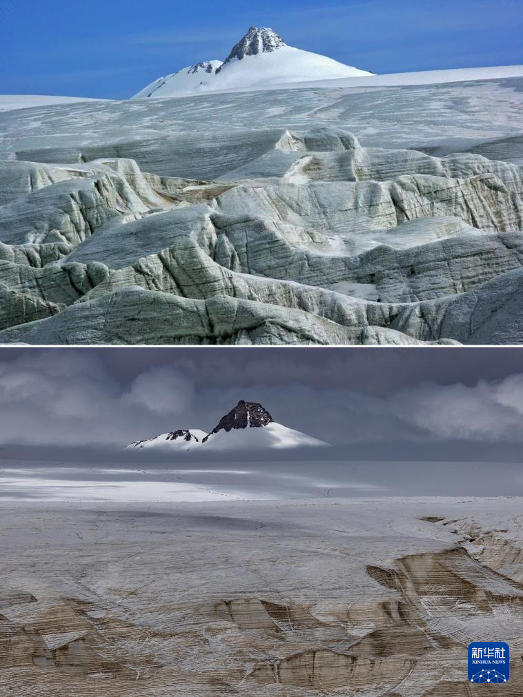 拼版照片:上圖為2009年6月拍攝的普若崗日主峰(新華社發(fā) 車剛攝);下圖為2024年9月4日拍攝的普若崗日主峰(新華社記者姜帆攝)。對比可以看出普若崗日主峰下的冰原消融嚴重。新華社發(fā)