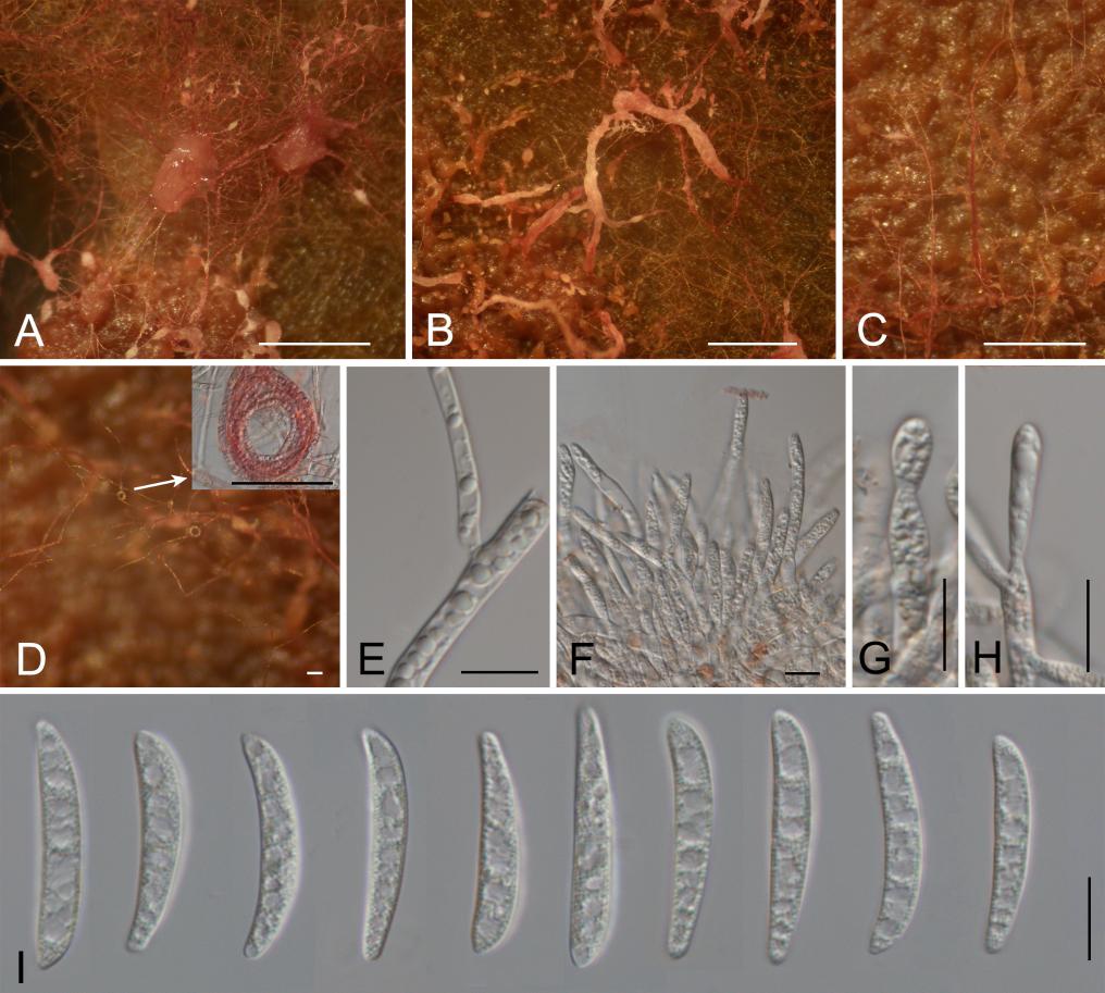西藏梭孢菌的形態(tài)。A、B:PDA上形成的分生孢子團,C:紅色的菌絲,D:菌絲結(jié)環(huán),E:透明的菌絲,F(xiàn)-H:產(chǎn)孢細胞及初生的分生孢子,I:分生孢子。標尺A-C=500μm;D=50μm;E-I=10μm。(西藏自治區(qū)生態(tài)環(huán)境廳供圖)