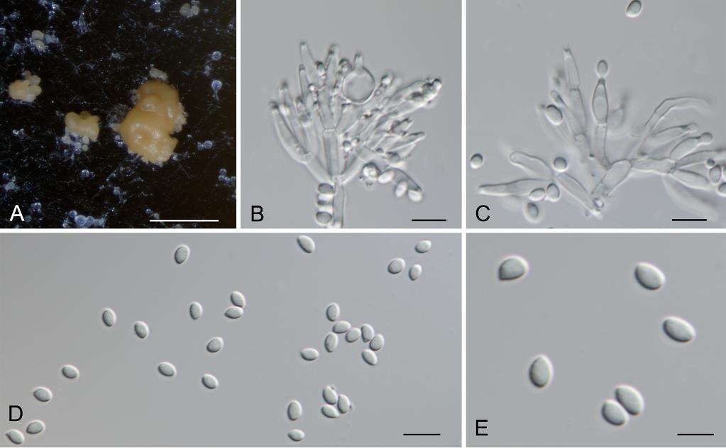 西藏螺旋聚孢霉的形態(tài)。A:PDA上形成的分生孢子團,B、C:產(chǎn)孢細胞及初生的分生孢子,D、E:分生孢子。標尺A=300μm;B-E=10μm。(西藏自治區(qū)生態(tài)環(huán)境廳供圖)