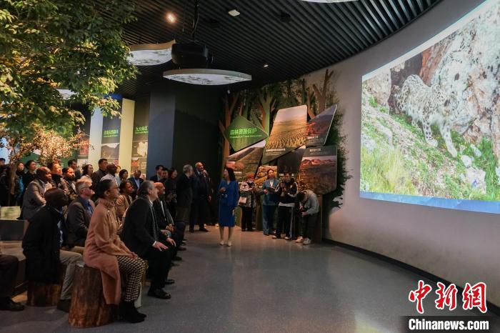圖為代表團一行在青海省自然資源博物館內(nèi)觀看高原旗艦物種雪豹的視頻。中新社記者 馬銘言 攝
