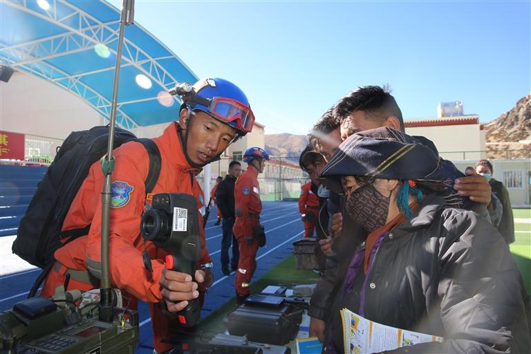 消防員向群眾介紹地震應(yīng)急設(shè)備功能。記者 格桑倫珠 通訊員 仁青卓瑪 攝