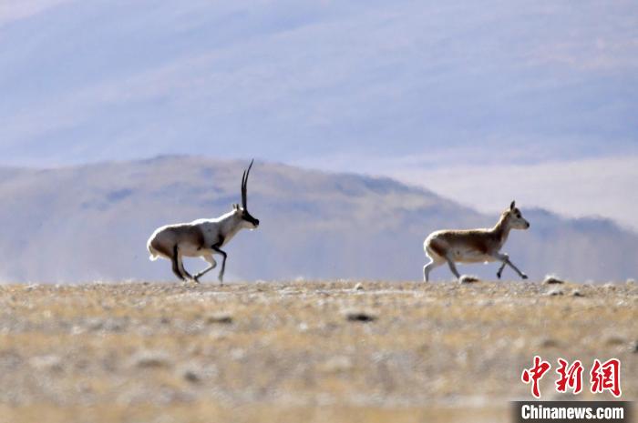 圖為12月8日,棲息在魯確塘草原的雄性藏羚羊正在追逐雌性藏羚羊。中新社記者 李林 攝