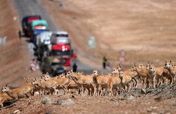 一群待產(chǎn)雌性藏羚羊通過(guò)青藏公路前往可可西里卓乃湖產(chǎn)仔(2023年5月29日攝)。新華社記者 張宏祥 攝