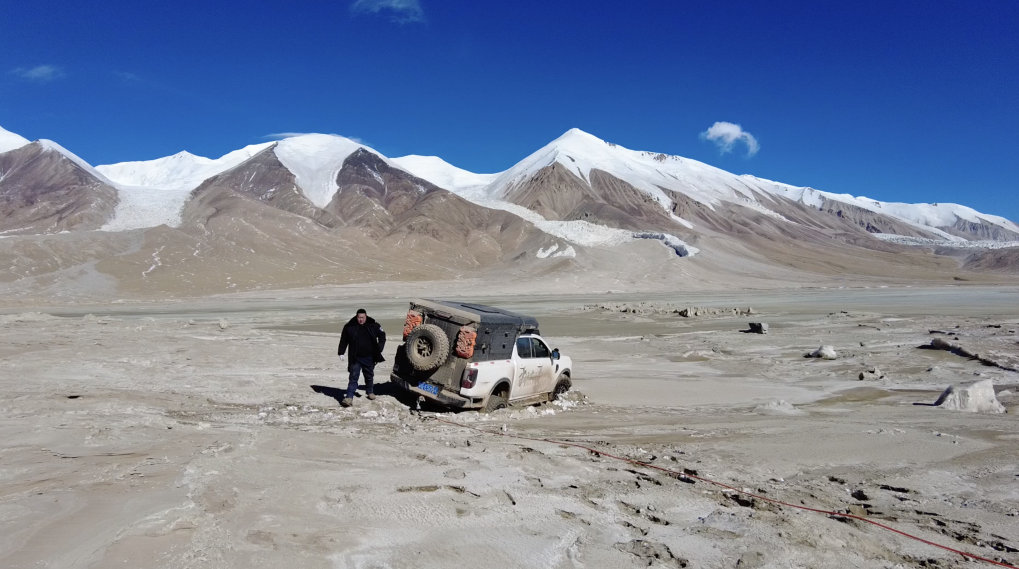 巡山隊(duì)員駕駛的車(chē)輛在布喀達(dá)坂峰山腳下陷入雪地中等待施救(攝于2025年1月14日)。新華社記者 杜笑微 攝