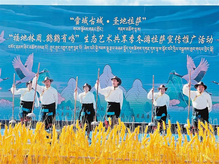 當溫暖的陽光輕柔地灑在拉薩河谷,黑頸鶴清脆的鳴叫聲喚醒了林周濕地寧靜的清晨?!案5亓种堋Q鶴有鳴”生態(tài)藝術(shù)共享季之“冬游拉薩”宣傳推廣活動,以歌舞表演、生態(tài)主旨演講、黑頸鶴攝影作品展、鶴文化專家座談等,融合了生態(tài)、藝術(shù)與文化的盛宴,讓人在雪山、湖泊與鶴影交織的詩意中,感受“冬游拉薩”的獨特魅力。