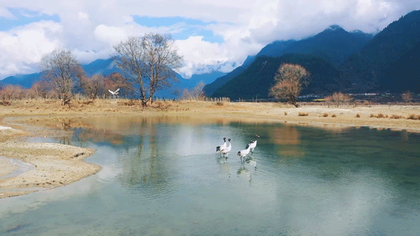 近日,在西藏波密縣境內,山野間綻放的油菜花、桃花與易貢湖畔翩躚起舞的黑頸鶴,勾勒出一幅充滿生機與活力的春光美景。