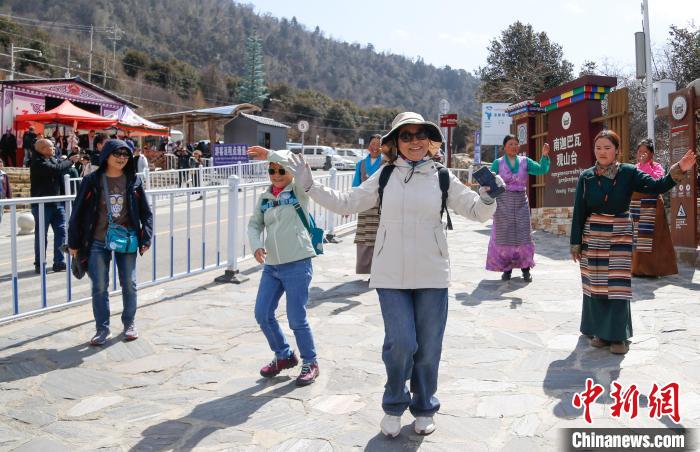 3月28日,西藏自治區(qū)林芝市,游客在雅魯藏布大峽谷旅游景區(qū)學(xué)跳藏族舞蹈。雅魯藏布大峽谷全長(zhǎng)504.6公里,最深處6009米,被認(rèn)為是世界上長(zhǎng)度最長(zhǎng)、深度最深的大峽谷。中新社記者 馬銘言 攝