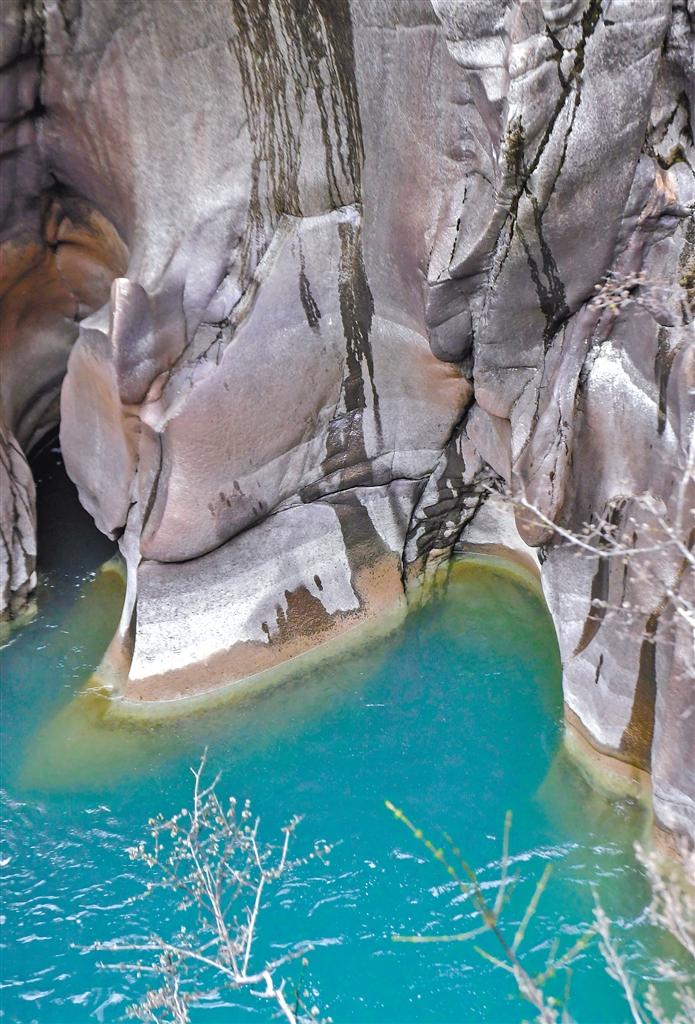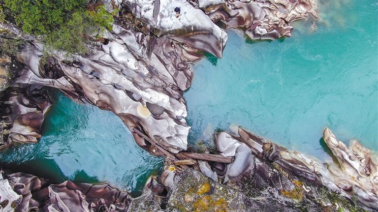 在丙察察公路接近察隅縣城的位置,國道219線與559線交匯點,有一處由水流反復沖刷激蕩出的地質(zhì)奇觀——水磨巖。