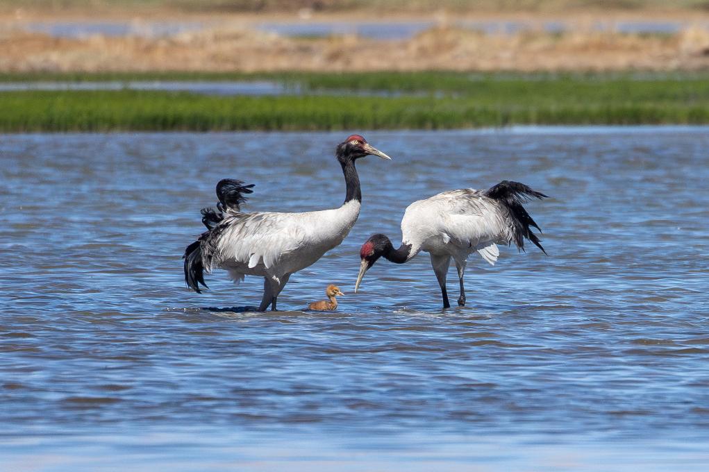 2024年6月9日,一對黑頸鶴帶著雛鳥在西藏那曲市申扎縣一處濕地棲息、覓食。新華社記者旦增尼瑪曲珠攝