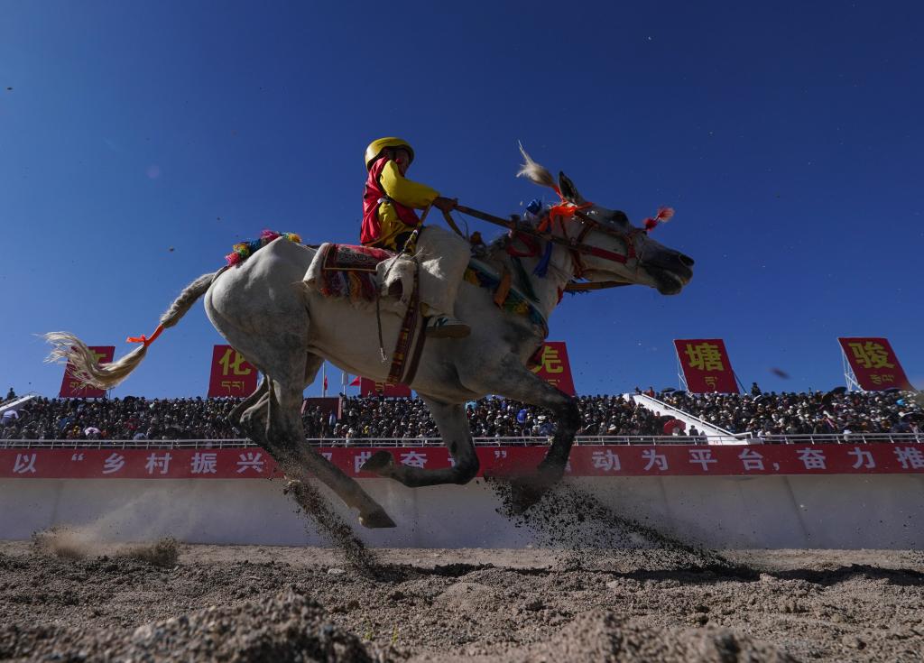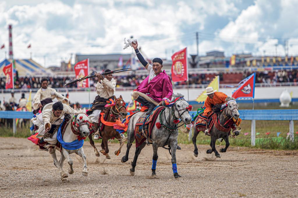 2024年8月11日,恰青賽馬節(jié)暨第三屆“鄉(xiāng)村振興那曲奮進”活動在西藏自治區(qū)那曲市色尼區(qū)開賽。這是選手在比賽中。新華社記者晉美多吉攝