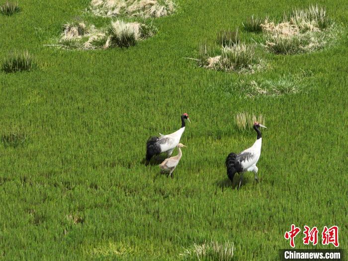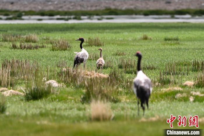7月10日,在海拔4700米的西藏自治區(qū)那曲市申扎縣濕地里,黑頸鶴一家在悠閑覓食。黑頸鶴是中國國家一級重點保護野生動物,屬高原特有鶴類,主要棲息于海拔2500米至5000米的高原沼澤地、湖泊及河灘等濕地環(huán)境。每年四月起,成對的黑頸鶴陸續(xù)飛抵西藏自治區(qū)那曲市申扎縣,在此繁育后代。近年來,申扎縣持續(xù)加強生態(tài)修復,濕地面積擴大、水質改善,為黑頸鶴等珍稀物種提供了理想家園。中新社發(fā) 毛建軍 攝