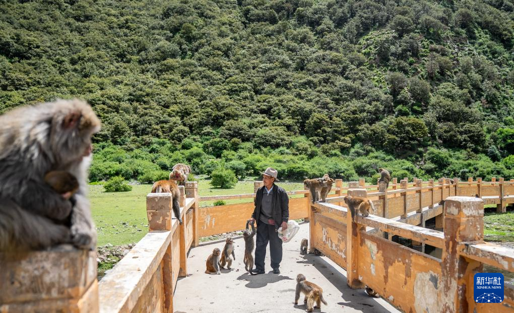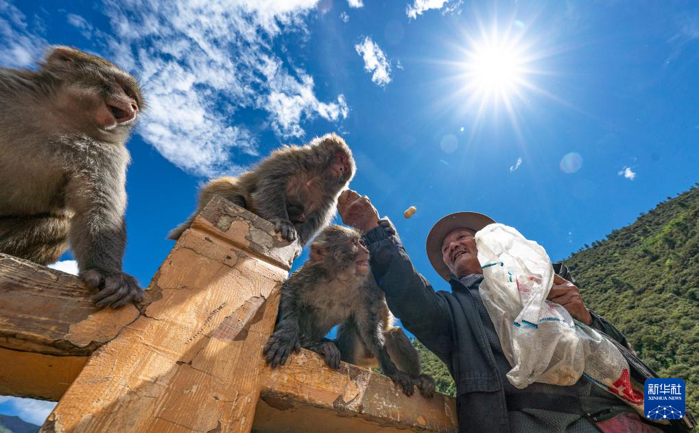 在林則生態(tài)文化旅游景區(qū),工作人員在為多布杰老人(中)準(zhǔn)備喂藏獼猴吃的花生(7月23日攝)。新華社記者 丁增尼達(dá) 攝