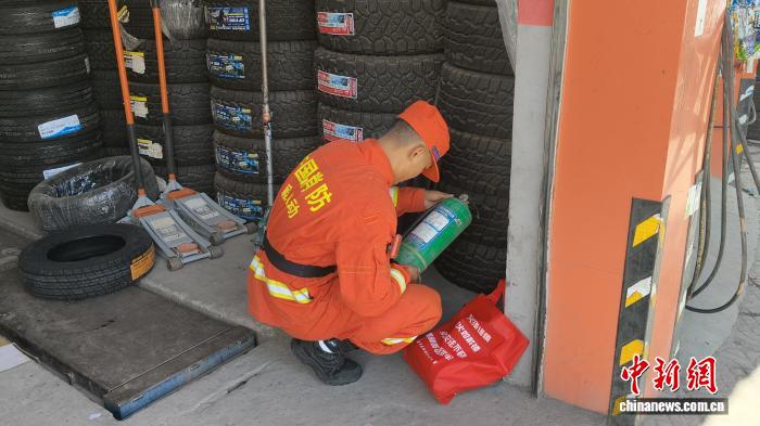 圖為消防隊(duì)員正在仔細(xì)檢查店內(nèi)消防器材是否完好有效。林芝市森林消防支隊(duì)供圖