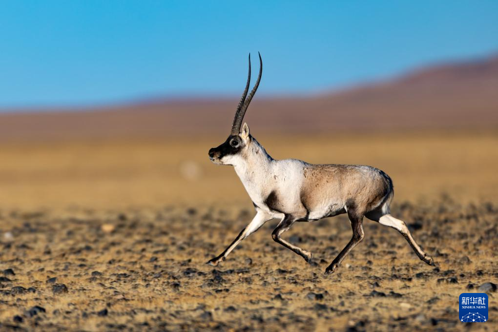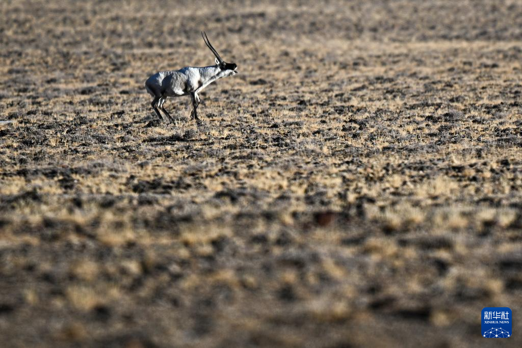 一頭雄性藏羚羊在羌塘國家級自然保護區(qū)的草原上奔跑(12月4日攝)。新華社記者 姜帆 攝