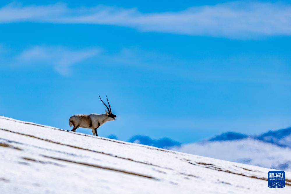 一頭雄性藏羚羊在羌塘國家級自然保護區(qū)的雪原上嗥叫,呼喚伴侶,挑戰(zhàn)對手(11月30日攝)。新華社記者 姜帆 攝