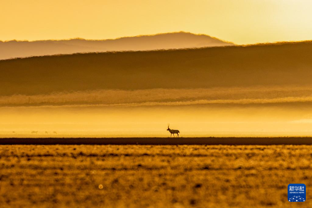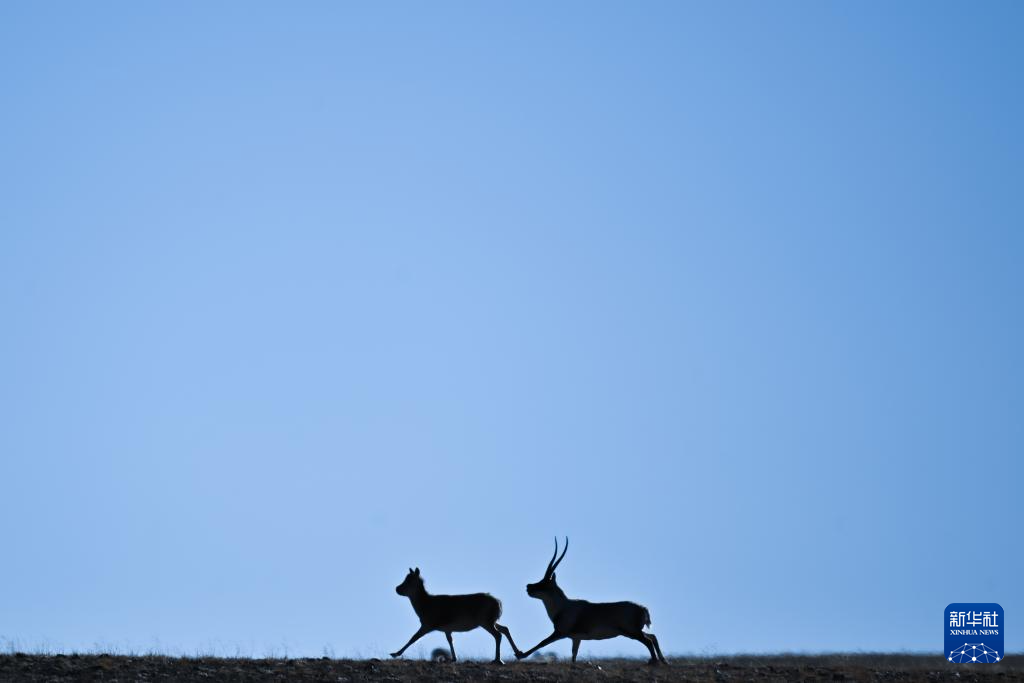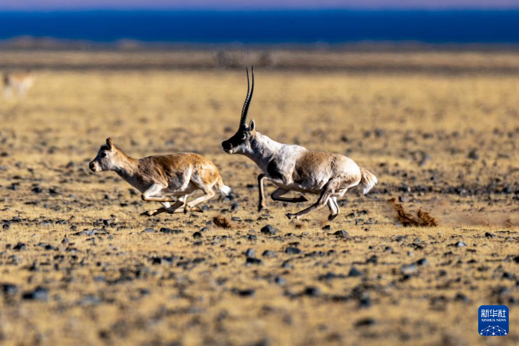 一頭雄性藏羚羊在羌塘國家級自然保護區(qū)的草原上追逐雌性藏羚羊(12月1日攝)。新華社記者 郭昱 攝