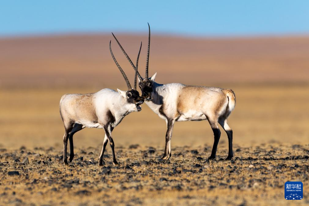 兩頭雄性藏羚羊在羌塘國家級自然保護區(qū)貼面嗥叫示威,準備爭斗(12月1日攝)。新華社記者 郭昱 攝