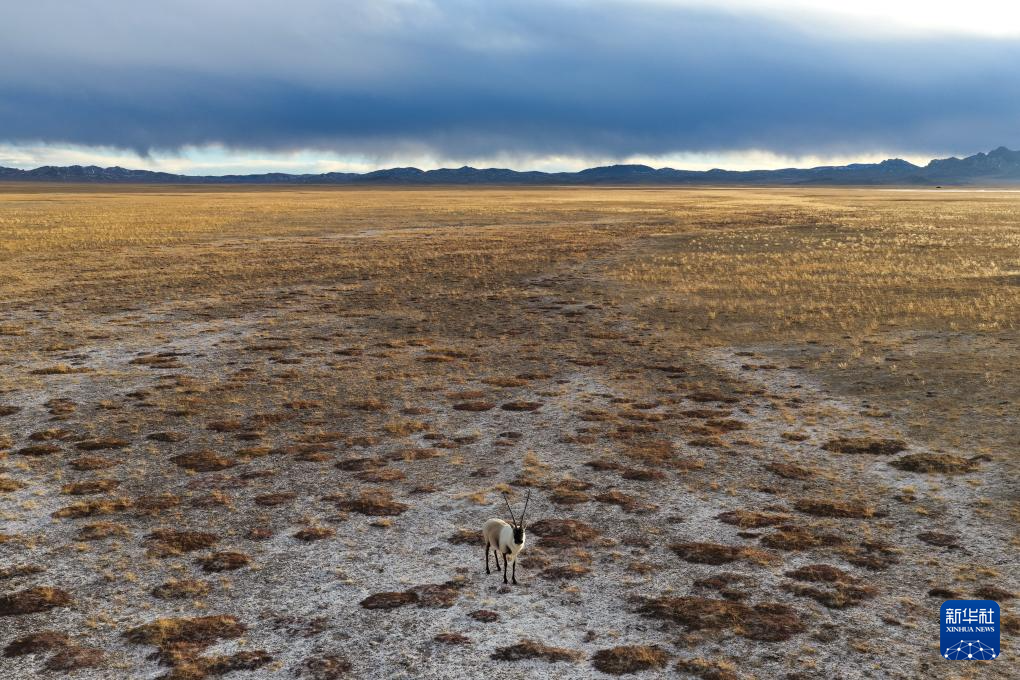 在阿爾金山國家級自然保護區(qū),一只雄性藏羚羊在覓食(12月5日攝,無人機照片)。新華社記者 辛悅衛(wèi) 攝