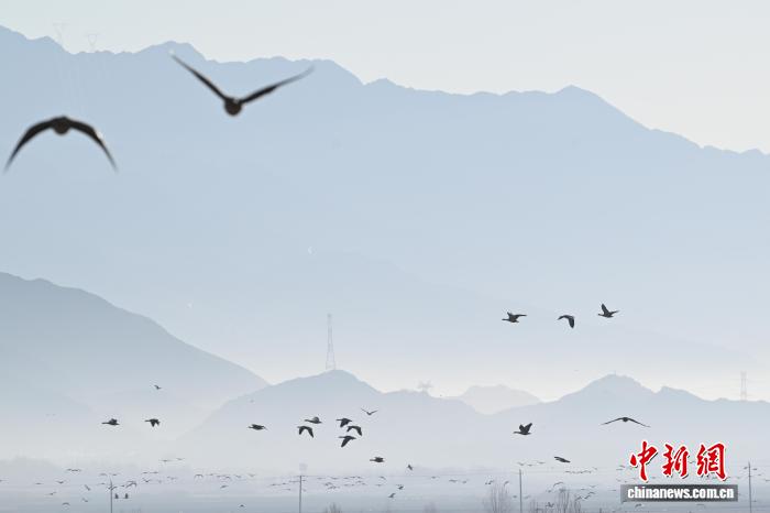 1月19日,西藏拉薩市林周縣黑頸鶴自然保護區(qū)內(nèi),成群候鳥在此越冬棲息。這里的濕地、農(nóng)田與水庫構(gòu)成絕佳棲息地,黑頸鶴、斑頭雁、赤麻鴨等萬余只候鳥在此集結(jié)。它們或凌空盤旋、或田間覓食,繪就高原生態(tài)畫卷。中新社記者 貢嘎來松 攝