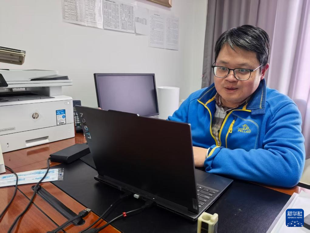 3月30日,楊樂通過黑頸鶴衛(wèi)星跟蹤數(shù)據(jù)管理系統(tǒng)查看遷徙情況。新華社記者蔣夢辰 攝