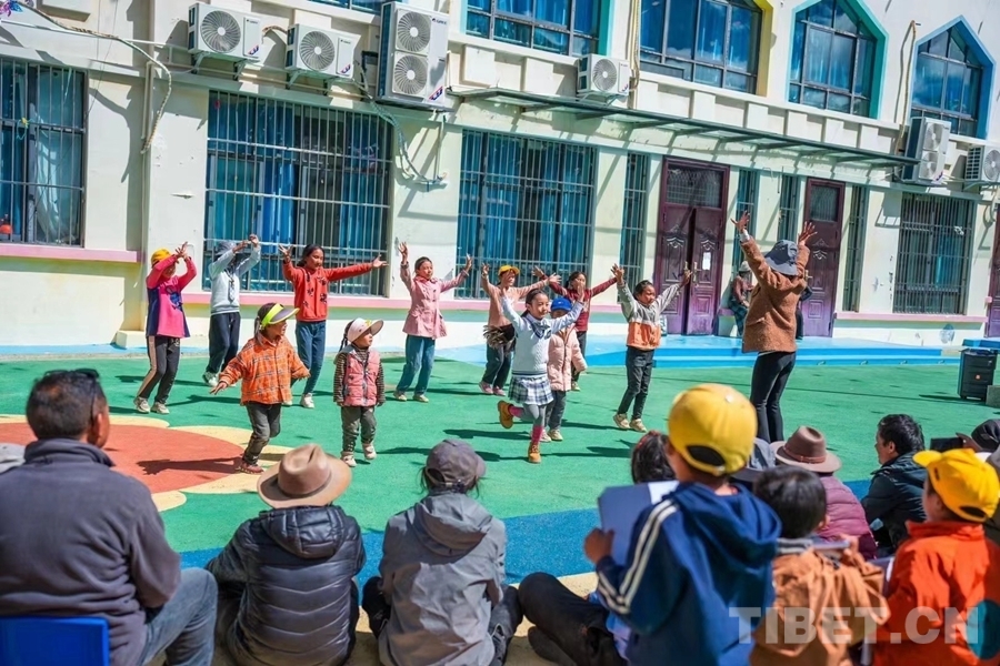 圖為洛桑卓瑪帶著自己拉薩的學(xué)員在日喀則市定日縣扎西宗鄉(xiāng)拉木堆村給當(dāng)?shù)睾⒆觽兩仙賰耗L囟Y儀培訓(xùn)課
