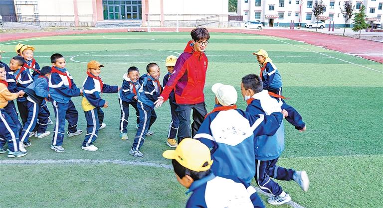 在娘蒲鄉(xiāng)中心小學(xué),嶺南師范學(xué)院支教隊(duì)成員胡正培課間與孩子們玩耍。