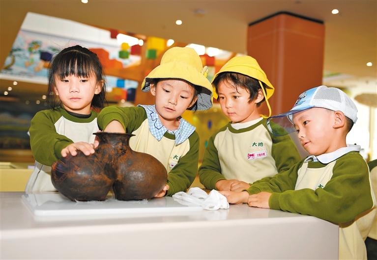 圖為孩子們?cè)谟^賞陶器模型。記者 王敏 攝