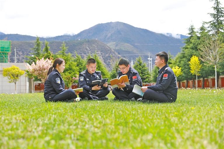 圖為林芝邊境管理支隊(duì)機(jī)關(guān)民警圍坐在一起讀書(shū)。記者 彭琦 通訊員 張力 攝