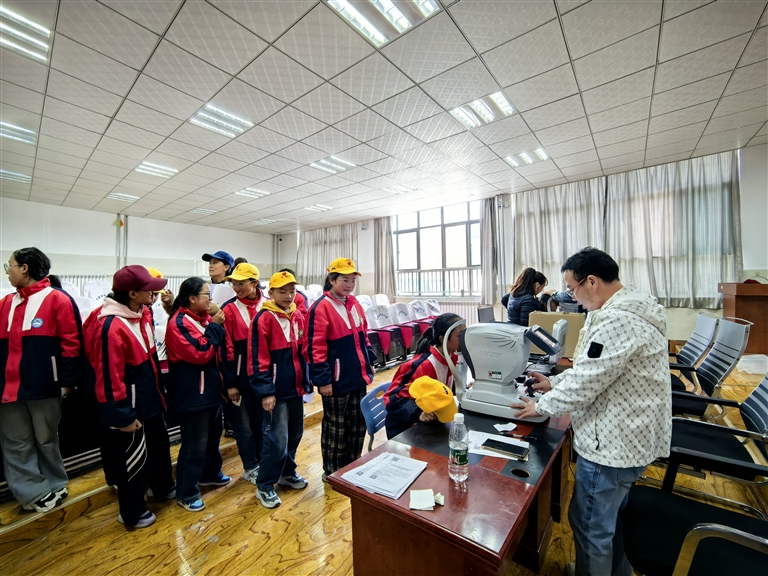 工作人員為學(xué)生進(jìn)行屈光檢測(cè)。記者 央金 攝