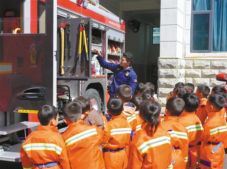 消防宣傳員向孩子們講解消防器材的使用方法。通訊員 次仁央宗 攝