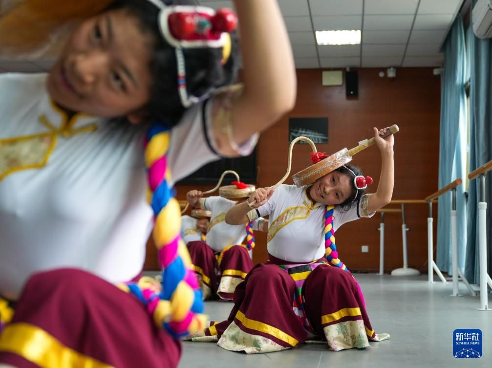 9月9日,在拉薩市第二中等職業(yè)技術(shù)學(xué)校,孩子們在練習(xí)熱巴舞。新華社記者 張笑宇 攝