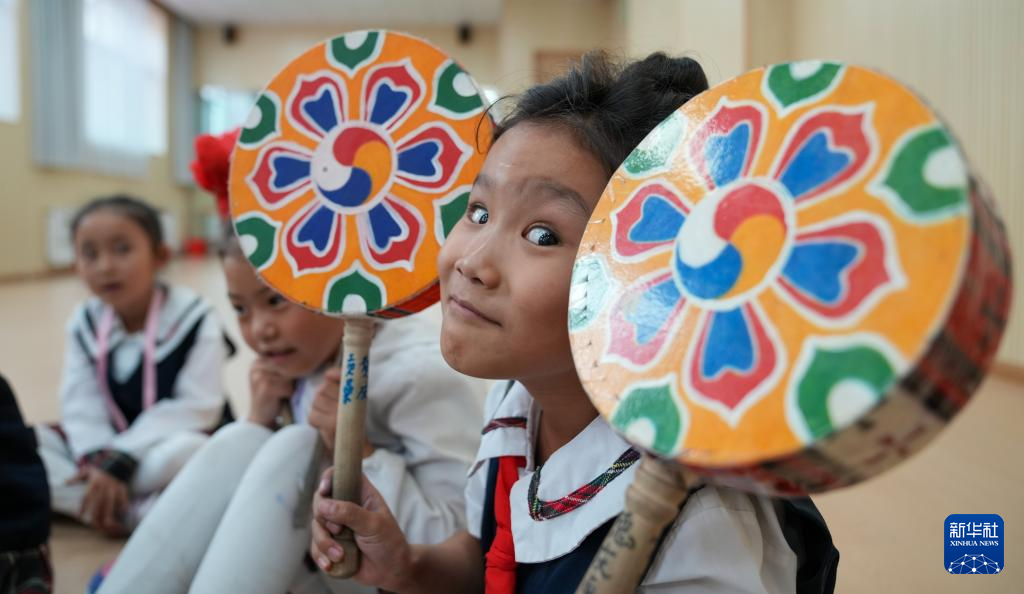 9月11日,在拉薩市實(shí)驗(yàn)小學(xué),孩子在練習(xí)熱巴舞間隙捧起繪有彩紋的熱巴鼓。新華社記者 晉美多吉 攝