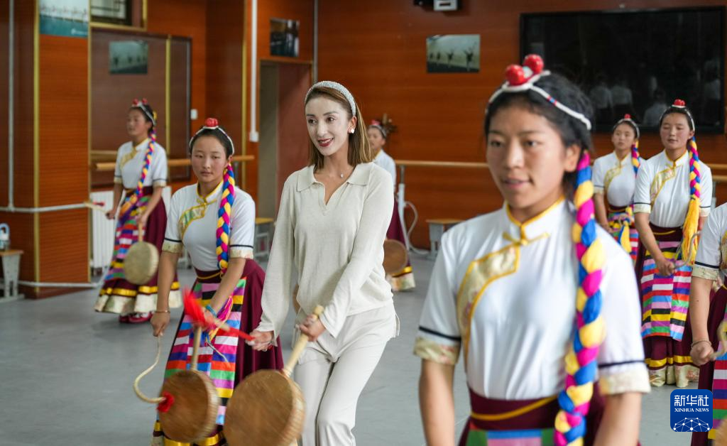 9月9日,在拉薩市第二中等職業(yè)技術(shù)學(xué)校,尼瑪卓瑪老師(右二)指導(dǎo)孩子們舞蹈動作。新華社記者 丁增尼達(dá) 攝