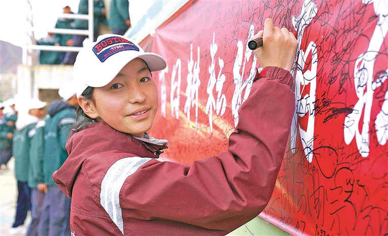 九年級(jí)學(xué)子在勵(lì)志橫幅上鄭重簽名。記者 格桑倫珠 攝