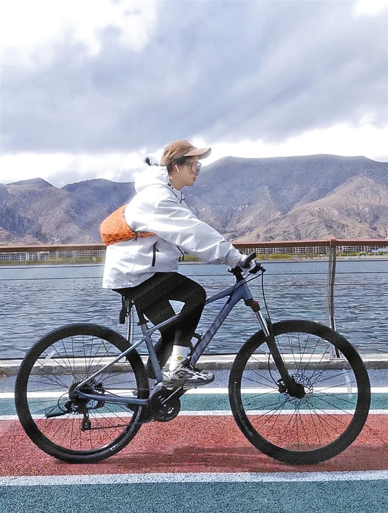 圖為在拉薩河畔騎行的市民。記者 余書冉 攝