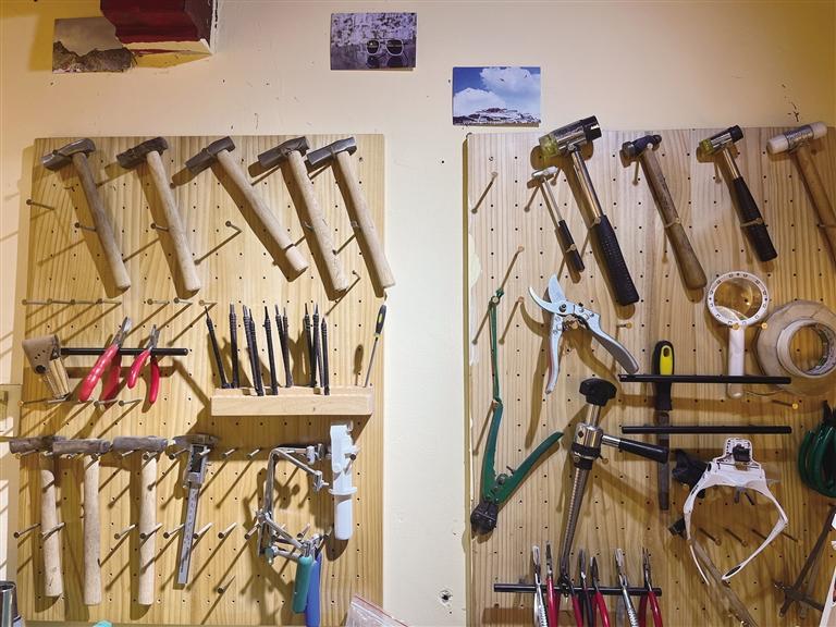 步入堯西平康古建大院,陽光灑落,透過蘋果樹與核桃樹的葉縫,投下片片陰涼,在樹下落座,幽思與怡然不禁飄然而至。耳邊偶爾會傳來陣陣“叮叮當當”清脆悅耳的敲打聲。聲音源自物喜手工工作室,工作室主理人是42歲的霍志勇,一位將激情與心血全部傾注在打銀工藝中的匠人?;糁居侣镁游鞑?2年,自2018年在云南學習了銀飾制作技藝后,便回到拉薩致力于探索當代元素與傳統(tǒng)藏式風格結(jié)合的手工銀飾制作。