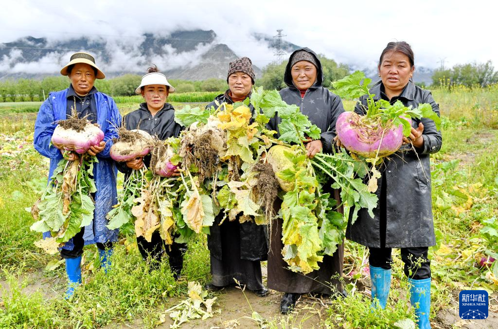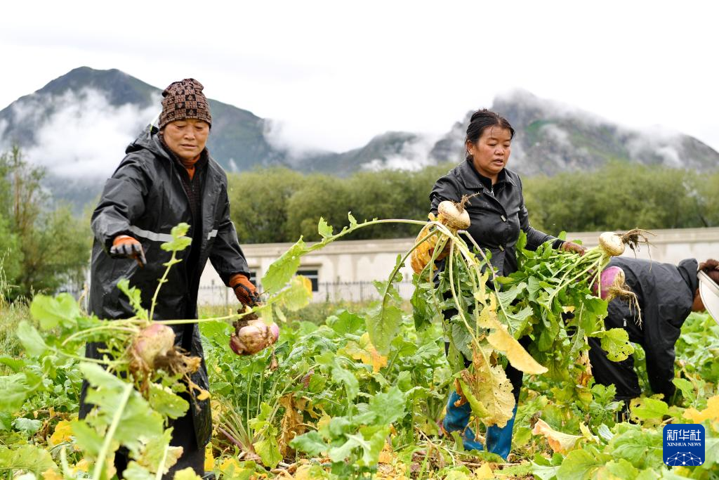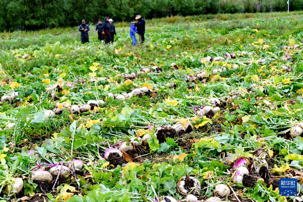 8月14日,拉薩市曲水縣才納鄉(xiāng)才納村村民在田間收蕪菁。新華社記者 張汝鋒 攝