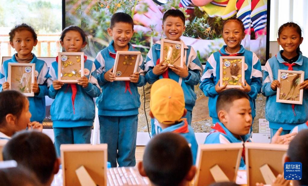 8月15日,拉魯小學(xué)的學(xué)生在拉魯濕地國家級(jí)自然保護(hù)區(qū)管理局科普小教室里向大家展示優(yōu)秀植物標(biāo)本。新華社記者 張汝鋒 攝