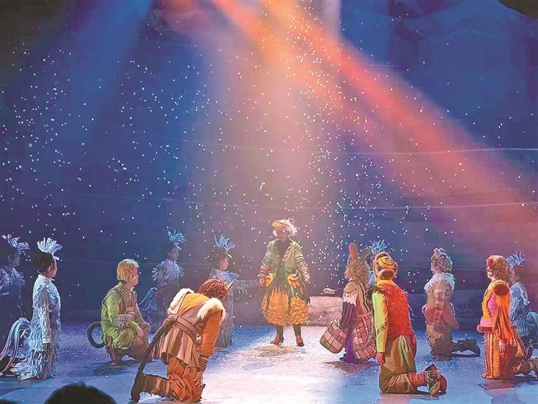 在敘事層面,《高原上的精靈》以“歌舞敘事”替代“對白敘事”:弦子、鷹笛、扎念琴與西方管樂混編,形成兼具雪域基因與童話色彩的聲場;踢踏、鍋莊、弦子舞被拆解為跺地、甩袖、旋轉等動能模塊,讓孩子一眼辨識“誰在跳”“為何而跳”。當藏野驢因干渴而倒地,音樂驟停,舞臺燈從暖黃轉為冷藍;子母湖重連時,黑頸鶴領唱童謠,全場又跟著節(jié)拍鼓掌——情感在被音樂標記的“空白”里自然發(fā)酵。全劇無論音聲還是動作,形式感極強又充滿童趣與活力,能深深吸引觀眾的目光。