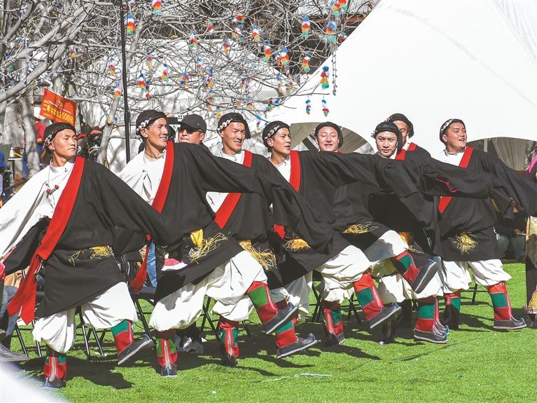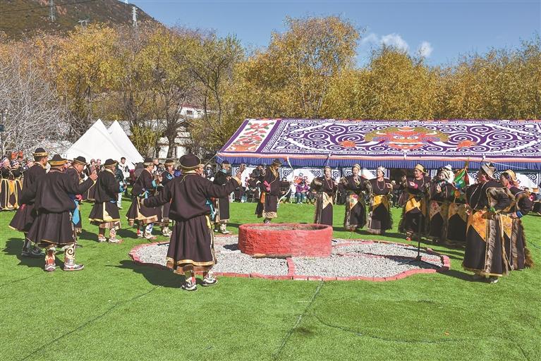 圖為林芝市布久鄉(xiāng)麥巴村群眾帶來的非遺舞蹈《工布切巴博》?!∮浾?劉楓 攝